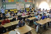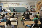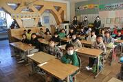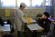 今日は1年生の教室に行き、給食はバランス良く、苦手なものも一口は食べるように呼びかけました。