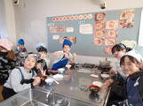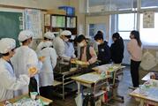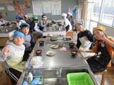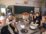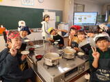 出汁は、にぼしから取りました。野菜などを切ったり、鍋の様子を見ながら具を加えたり、味噌の量も味を見ながら入れたり、班で協力して活動していました。